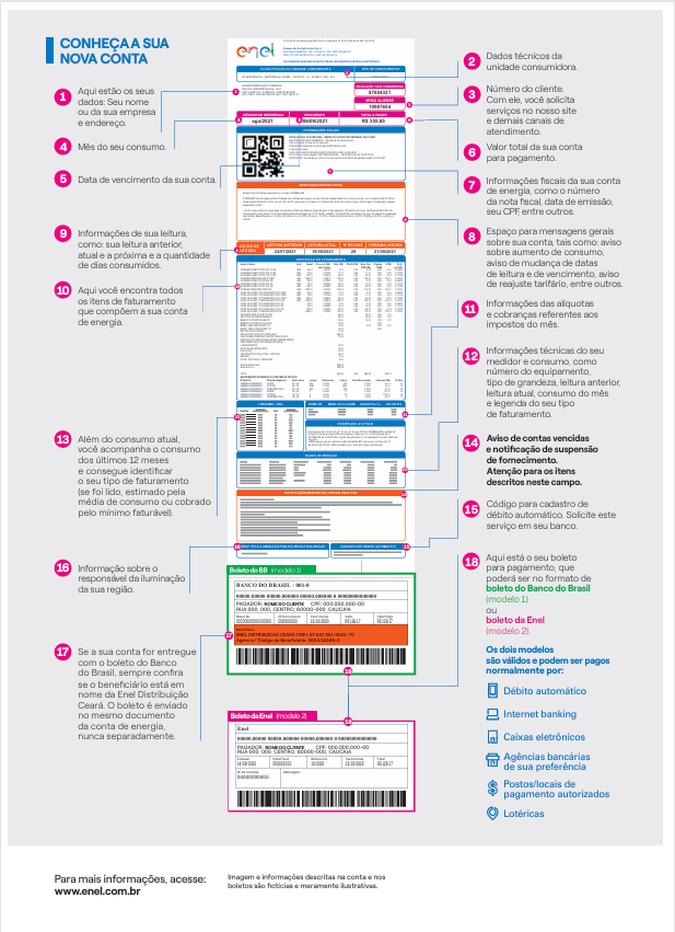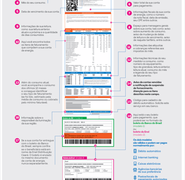 Para facilitar a compreensão dos campos da conta de energia elétrica, observe o modelo oficial extraído do site da Enel.