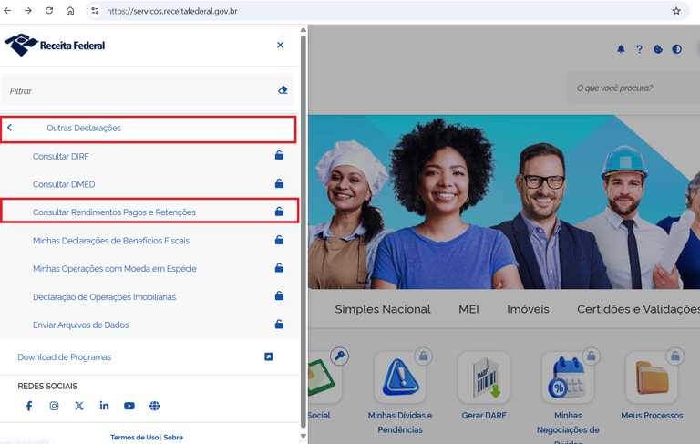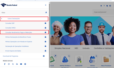 Após estar logado, localize do lado esquerdo, a barra localizada na parte superior esquerda da página, e no menu, clique em Negócios > Declarações > Outras Declarações > Consultar Rendimentos Pagos e Retenções, conforme as figuras abaixo.